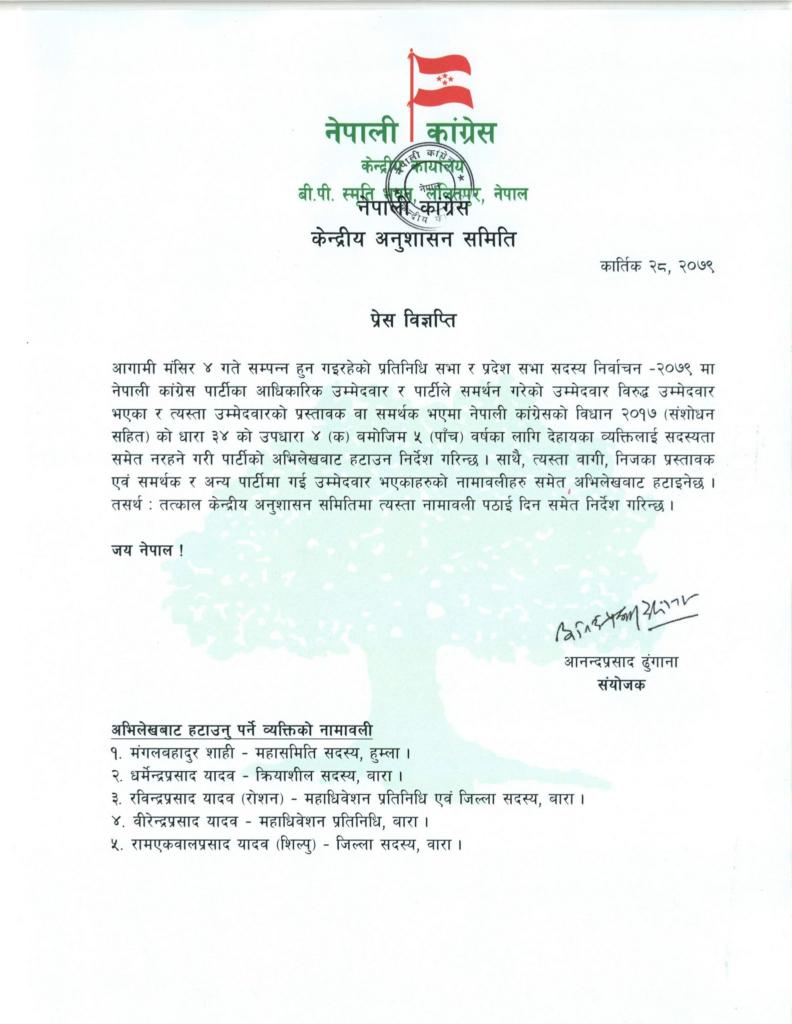 “आसन्न निर्वाचनमा आधिकारिक उमेदवार र पार्टीले समर्थन गरेको उमेदवारविरुद्ध उमेदवार भएका र त्यस्ता उमेदवारको प्रस्तावक वा समर्थक भएमा नेपाली कांग्रेसको विधान २०१७ (संशोधनसहित) को धारा ३४ को उपधारा ४ (क) बमोजिम ५ वर्षका लागि देहायका व्यक्तिलाई सदस्यता समेत नरहने गरी पार्टीको अभिलेखबाट हटाउन निर्देश गरिन्छ,” समितिले जारी गरेको विज्ञप्तिमा उल्लेख छ, “त्यस्ता बागी, निजका प्रस्तावक एवं समर्थक र अन्य पार्टीमा गई उमेदवार भएकाहरुको नामावलीहरु समेत अभिलेखबाट हटाइनेछ ।”