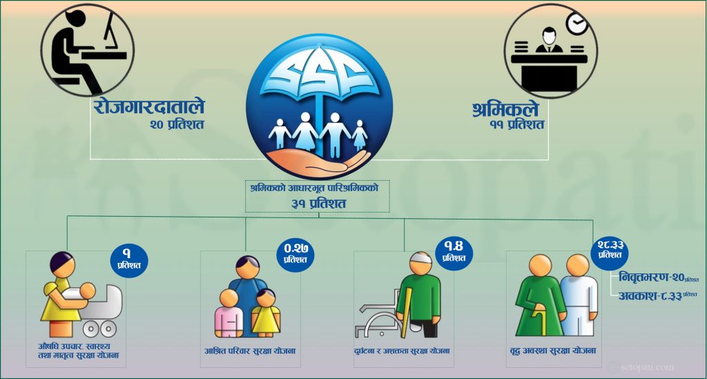 सामाजिक सुरक्षा कोषमा कुल ३१ प्रतिशत योगदानमध्ये निवृत्तिभरणमा २० प्रतिशत रकम जाने गरेको छ। ८.३३ प्रतिशत अवकाश योजनामा छुट्याइन्छ।