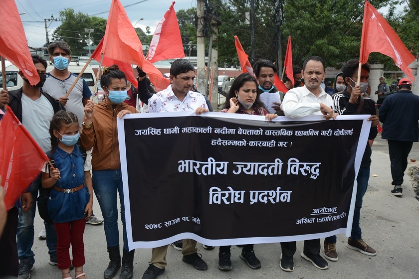 दार्चुलाको महाकाली नदीमा जयसिंह धामी वेपत्ता भएको घटनालाई लिएर अखिल क्रान्तिकारीले काठमाडौंस्थित भारतीय राजदूतावासको कार्यालय अगाडि प्रदर्शन गरेको छ । सोमबार सो संगठनले भारतीय ज्यादती बढेको भन्दै त्यसको विरोधमा दूतावास अगाडि प्रदर्शन गरेको हो ।