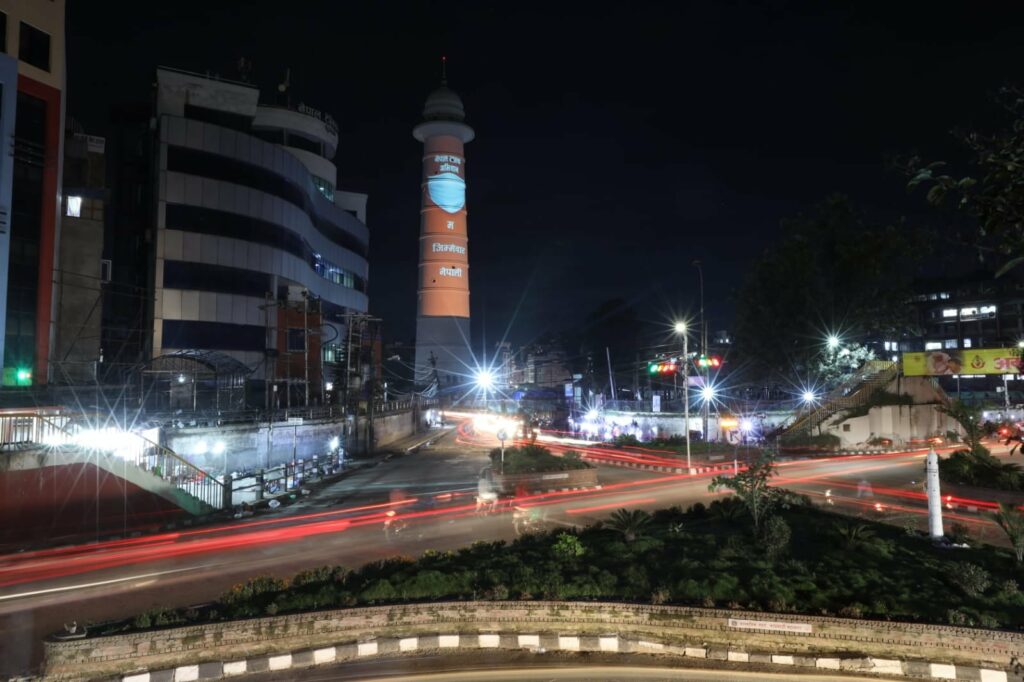 काठमाडौं सुन्धारास्थित नवनिर्मित धरहरामा प्रकाश पारेर नेपालमा मास्क अभियान सुरू भएको छ।
