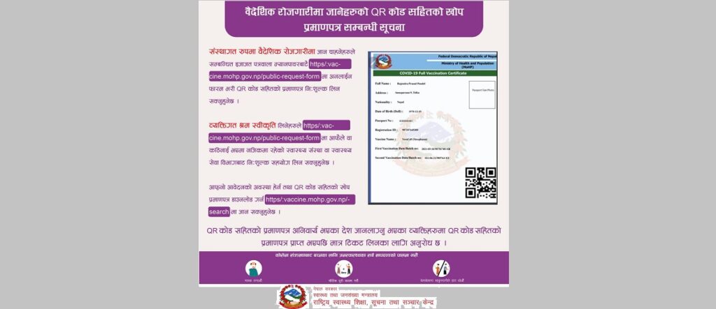 कोरोना खोप लगाएको क्यूआर कोडसहितको प्रमाणपत्र अब अनलाइनबाटै लिन मिल्ने भएको छ।