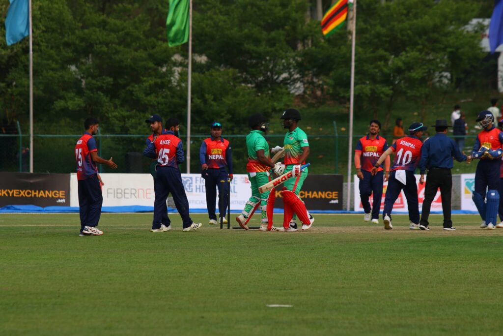 वर्षाअघि त्रिवि मैदानमा टस हारेर ब्याटिङ थालेको जिम्बावेले ४.३ ओभरमा २ विकेट गुमाउँदै ४८ रन बनाएको अवस्थामा भारी वर्षा भएको थियो । जसका कारण खेल रोकिन पुगेको हो ।