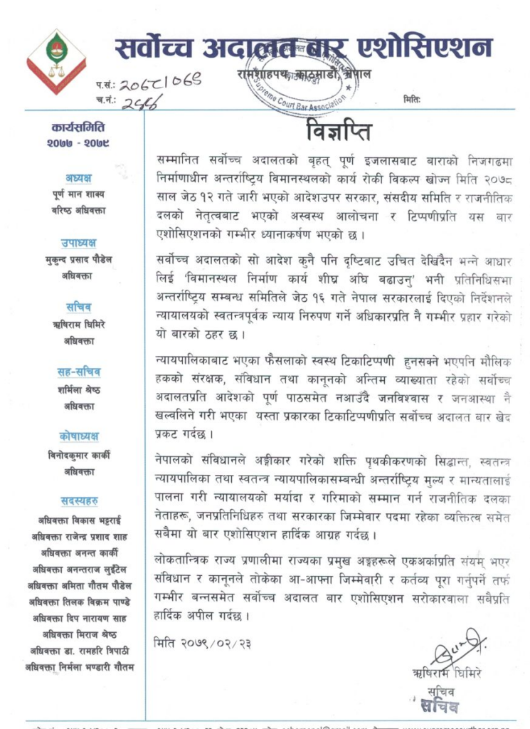 प्रतिनिधिसभाअन्तर्गतको अन्तर्राष्ट्रिय सम्बन्ध समितिले जेठ १६ गते सर्वोच्च अदालतको आदेश कुनै पनि दृष्टिबाट उचित नदेखिने आधार बनाएर ‘विमानस्थल निर्माण कार्य शीघ्र अघि बढाउनू’ भनी सरकारलाई दिएको निर्देशनले न्यायालयको स्वतन्त्रपूर्वक न्याय निरूपण गर्ने अधिकारमाथि नै गम्भीर प्रहार गरेको बारको ठहर छ ।