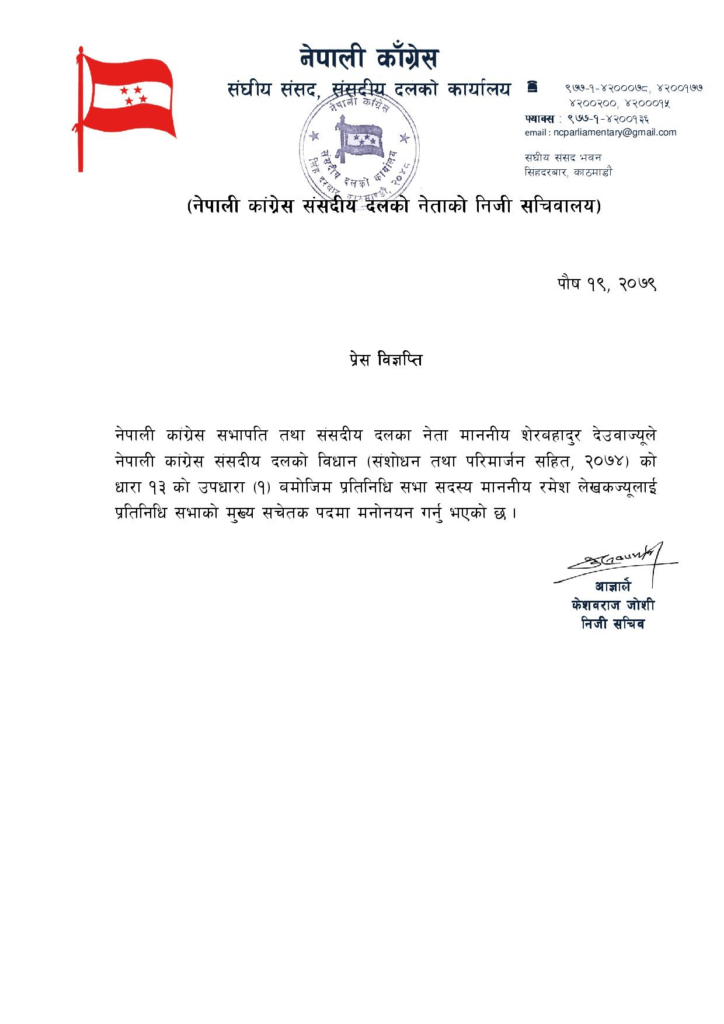 सभापति शेरबहादुर देउवाले केन्द्रीय सदस्यसमेत रहेका प्रतिनिधि सभा सांसद रमेश लेखकलाई मुख्य सचेतक नियुक्त गरेका हुन्।