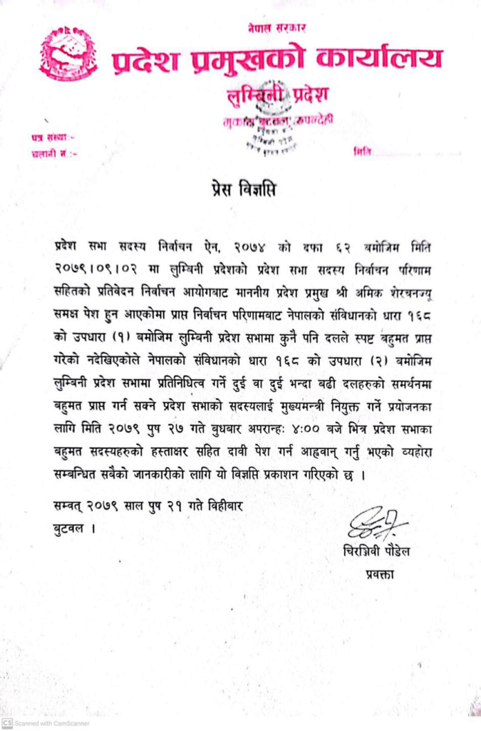 लुम्बिनी प्रदेशसभामा कुनै दलको बहुमत नभएकाले दुई वा दुई भन्दा बढी दलको समर्थनमा बहुमत प्राप्त प्रदेशसभा सदस्यलाई मुख्यमन्त्रीमा दावी पेश गर्न आह्वान गरेका हुन् ।