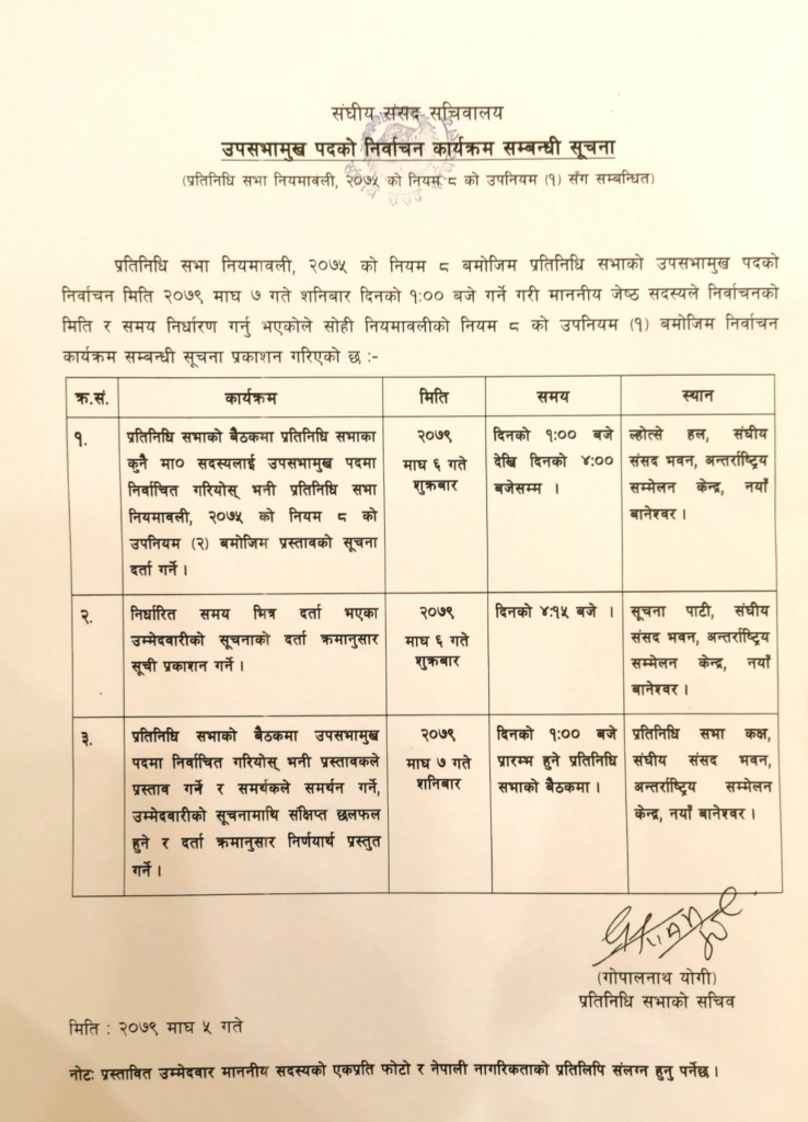 यही माघ ७ गते शनिबार उपसभामुख चयनका लागि निर्वाचन हुने भएको छ।