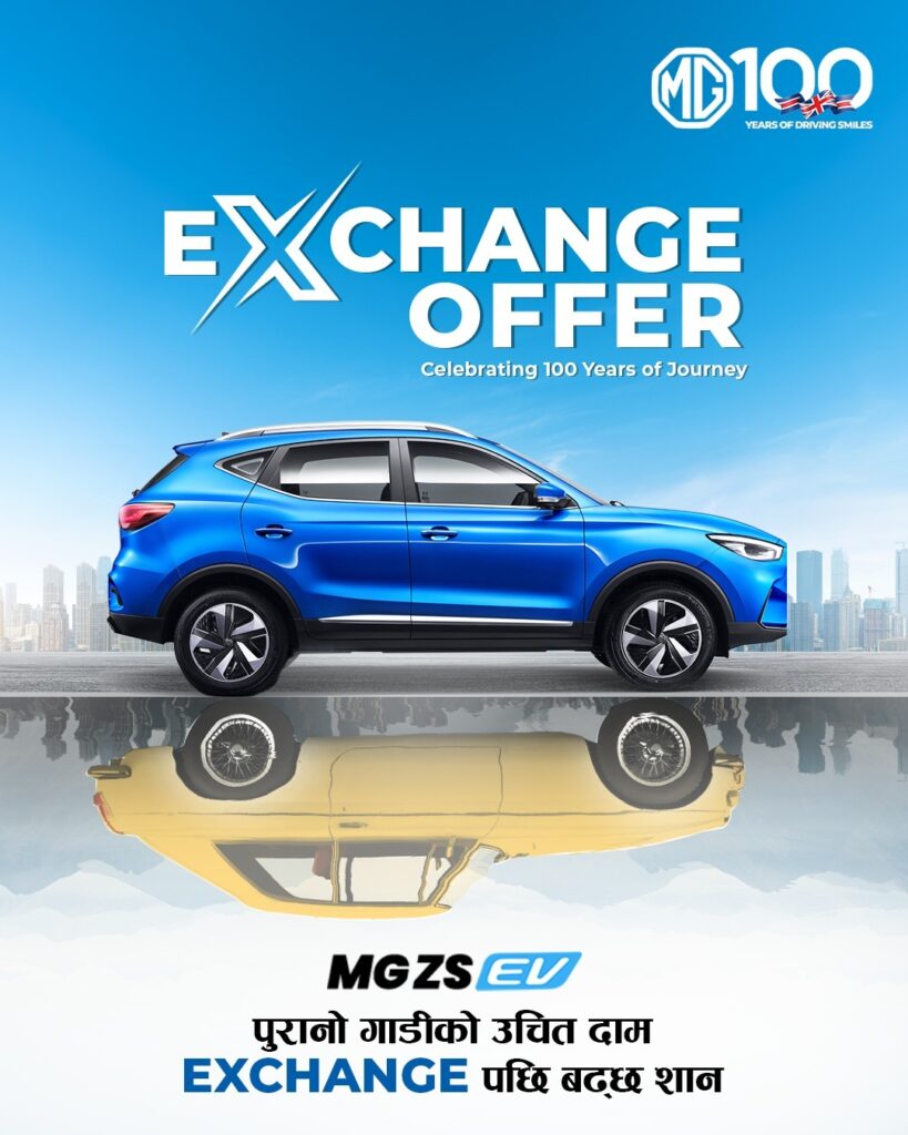 यसअन्तर्गत ग्राहकहरूले कुनै पनि पुरानो गाडीको सट्टामा नयाँ एमजी जेडएस ईभी घर लैजान सक्ने कम्पनीले जनाएको छ ।