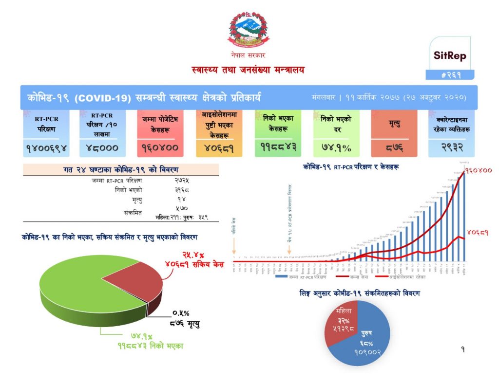 देशभर कोरोनाभाइरस संक्रमितको संख्या १ लाख ६० हजार ४०० पुगेको छ। संक्रमितमध्ये हालसम्म १ लाख १८ हजार ८४३ जना निको भएको स्वास्थ्य तथा जनसंख्या मन्त्रालयले मंगलबार जानकारी दिएको छ ।