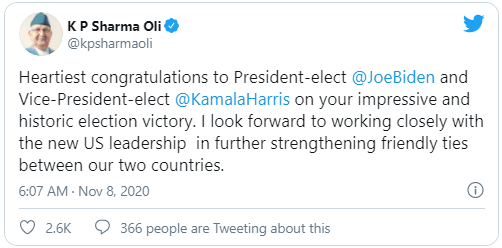 प्रधानमन्त्री ओलीले सामाजिक सञ्जाल ट्वीटरमार्फत बाइडेन र कमलालाई प्रभावकारी र ऐतिहासिक जितका लागि बधाई दिँदै अमेरिकाको नयाँ नेतृत्वसँग नजिक रहेर काम गर्ने अवसर प्राप्त हुने विश्वास व्यक्त गरेका छन् ।