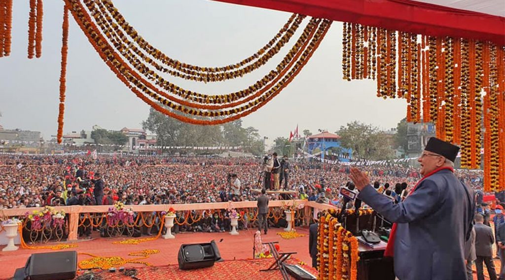 पुस ५ गते प्रतिनिधि सभा विघटनसँगै विभाजित नेकपाको प्रचण्ड-माधव समूह सडक आन्दोलनमा छ भने सत्तामा रहेको ओली समूहले पनि सभाहरु गरेर  शक्ति प्रदर्शन गर्दै आएको छ । माघ २३ मा काठमाडौंमा सभा गरेको यो समूहले शनिबार बलियो पकड मानिएको लुम्बिनी प्रदेशको बुटवललाई शक्ति प्रदर्शन गरेको छ ।