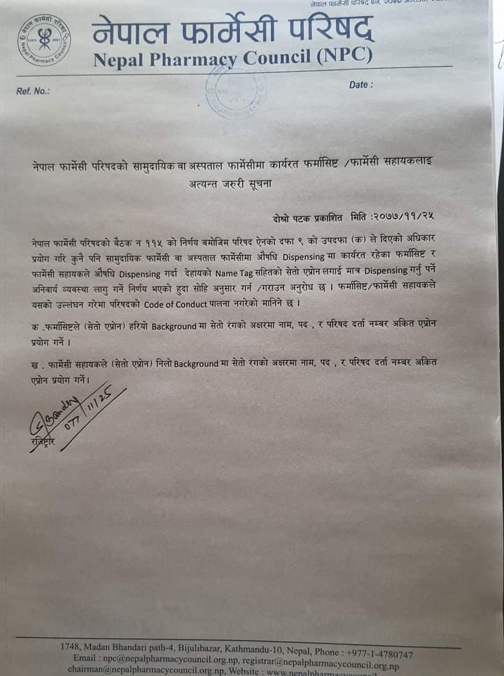 परिषद्ले मंगलबार एक सूचना जारी गर्दै फर्मासिष्टलाई सेतो एप्रोनमा हरियो पृष्ठभूमि भएको सेतो रंगको अक्षरमा नाम, पद र परिषद् दर्ता नम्बर अंकित गरेर लगाउन निर्देशन दिएको छ ।