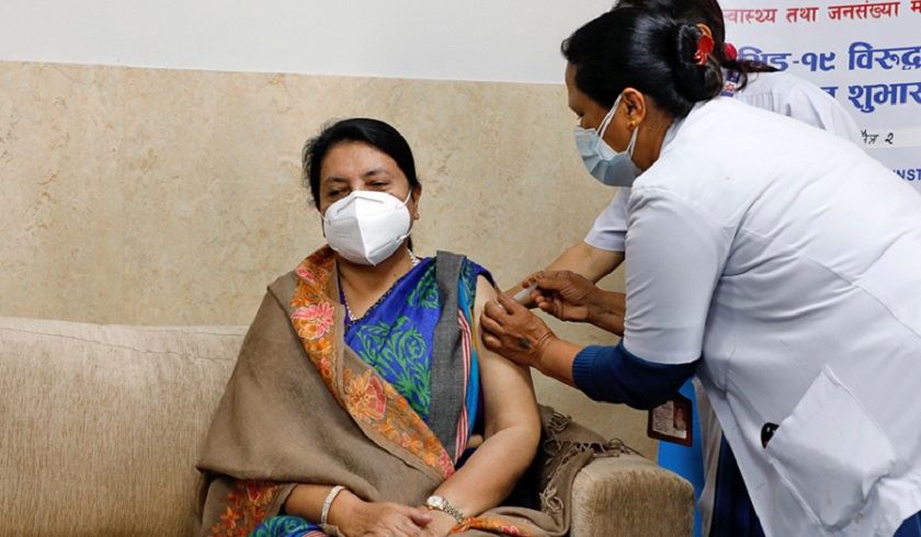 काठमाडौं । राष्ट्रपति विद्यादेवी भण्डारीले कोरोना विरुद्ध खोप लगाएकी छन् । सोमबार महाराजगञ्जस्थित त्रिभुवन विश्वविद्यालय शिक्षण अस्पताल पुगी उनले खोप लगाएकी हुन् । खोप लगाएपछि सञ्चारकर्मीलाई संक्षिप्त प्रतिक्रिया दिँदै राष्ट्रपति भण्डारीले सबैलाई निर्धक्क भएर खोप लगाउन अपिल पनि गरिन् ।