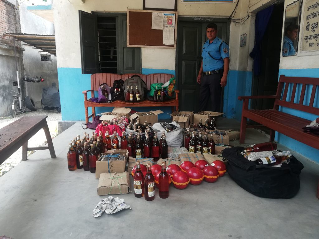प्रहरीका अनुसार उनको साथबाट प्रहरीले ८४ बोतल ‘सिक्किम गोल्डेन’ र ११ बोतल ‘फायरबल’ मदिरा बरामद गरेको छ ।