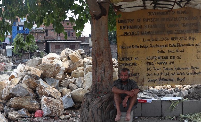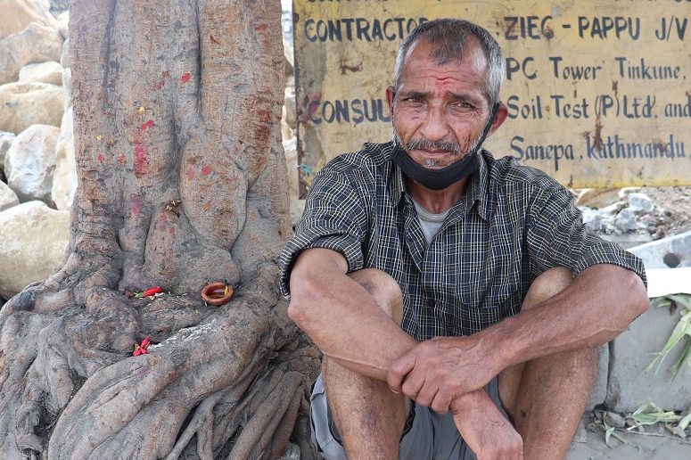 निषेधाज्ञायता पूर्णबहादुरले गह्रुँगो सामान उचाल्न पाएका छैनन्। हात र पिठ्यूँलाई हाइसञ्चो भए पनि पेट हुँडलिँदा मन भारी भएको छ। त्यही बोझले धर्मराएका उनी चौतारीमा बसिरहेका छन्।