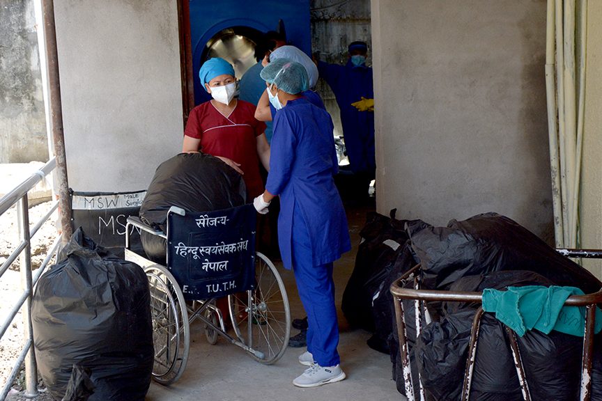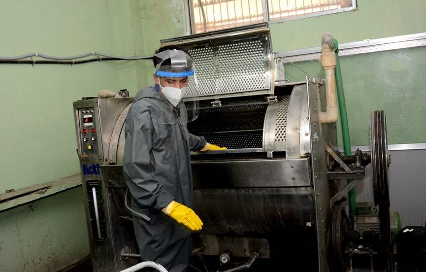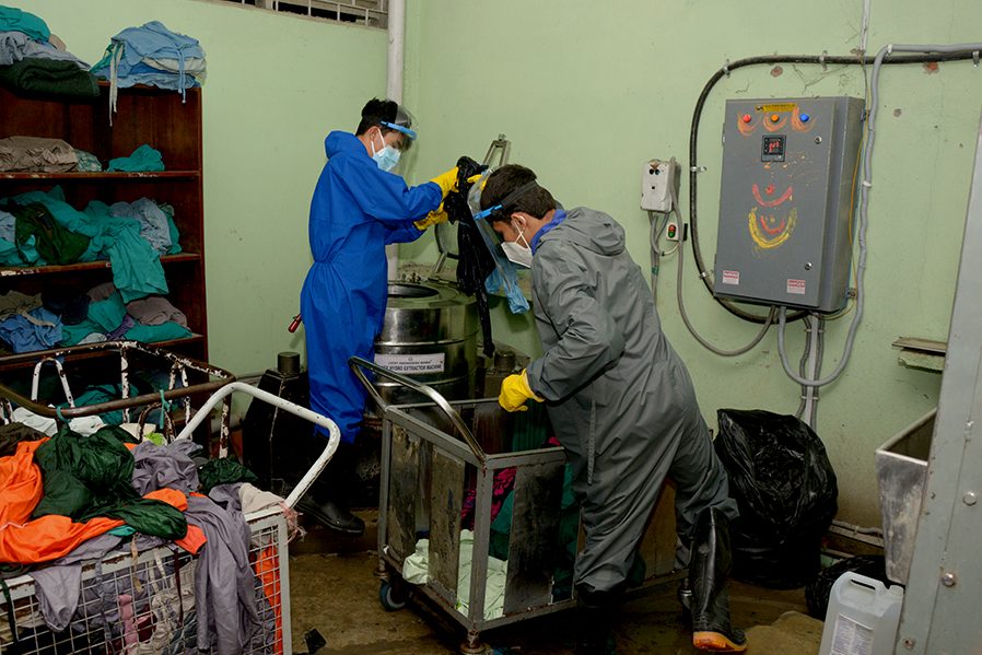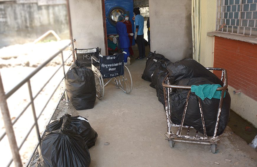 कोरोनाभाइरस संक्रमित बिरामीले प्रयोग गरेको गाउन, बेड कभर, सिरानीको खोल, पातला खालका ब्ल्याङ्केट, डाक्टर, नर्स तथा स्वास्थ्यकर्मीले प्रयोग गरेका पीपीई संकलन गरेर धुन लैजाने र पुनः प्रयोगका लागि वार्डमा पु¥याउन त्यस्ता कर्मचारी दैनिक खटिएका हुन्छन् ।