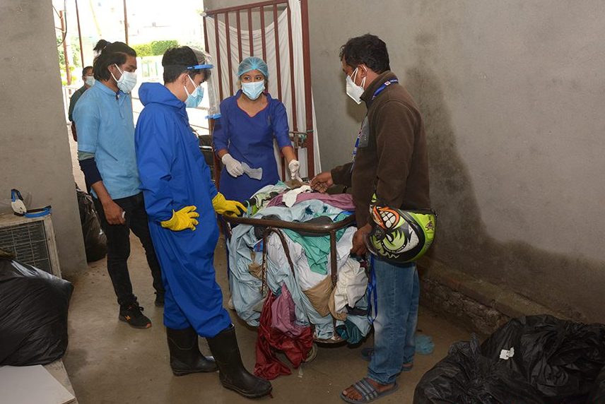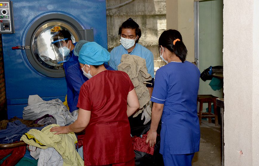 ‘दिनरात यही कोभिड वार्डमा प्रयोग गरिएका लुगा छुने हुँदा कोरोनाभाइरस सामान्य हो जस्तो लाग्न थालिसकेको छ हामीलाई,’ कर्मचारी रमेश रम्तेल भन्छन्, ‘लुगा धुने मेसिनमा भाइरस मार्ने औषधि, सरफ लगायतका सामग्री राख्छौं तर लुगा ल्याउँदा र पु¥याउन जाँदा संक्रमण सर्ने सम्भावना उच्च हुन्छ ।’